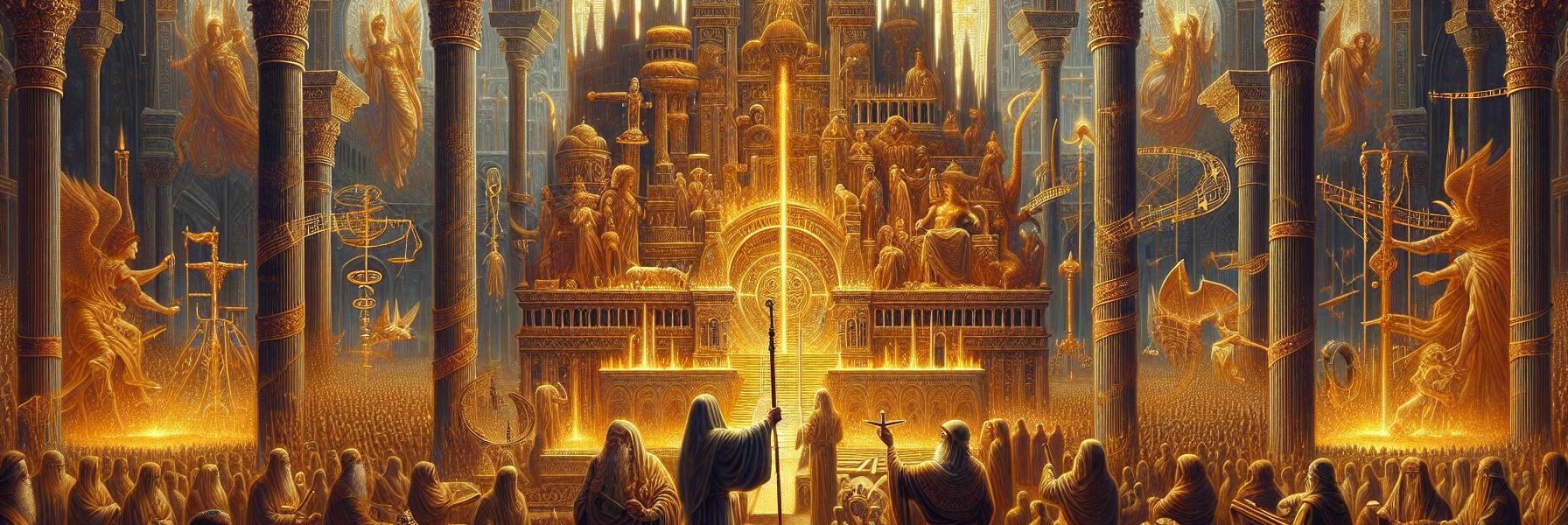 終わりの時が近づくにつれ、天の神殿から七つのラッパを持つ七人の御使が現れた。その時、一人の大いなる御使が金色の葦の杖を持って現れ、天と地を貫く声で宣言した。「神の聖所と祭壇と、そこで礼拝する者たちを測れ。しかし、外の庭は異邦人に与えられており、彼らは聖なる都を四十二か月の間踏みにじるであろう」