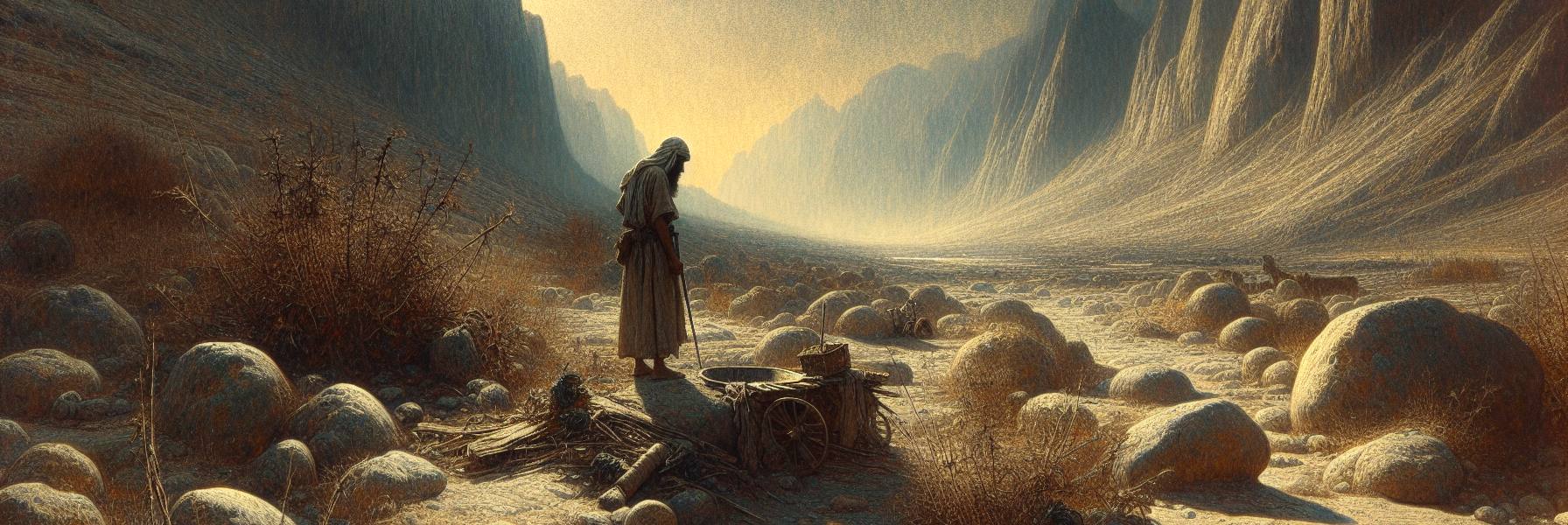 荒野の風は熱く、砂が歯の間にざらりと当たる。ヨハネからバプテスマを受けてから、もう四十日が過ぎていた。イエスの唇は乾き、荒れた革のようになり、目の前には死海の青が、遠くでゆらめいていた。昼は灼熱の太陽が岩を焼き、夜は急に冷え込み、獣の遠吠えが聞こえることもあった。