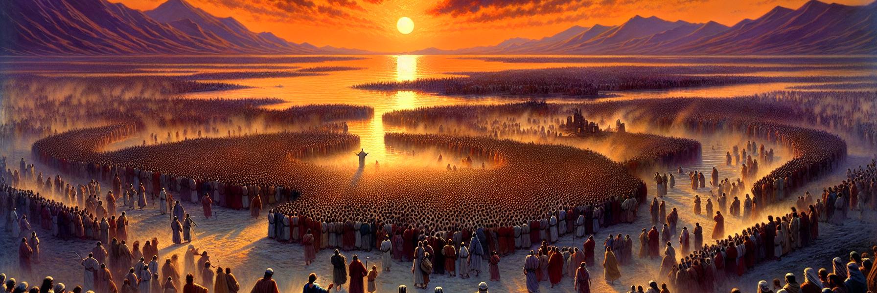 弟子たちが配って回ると、パンは不思議に増え続けた。漁も同じように。人々は満腹するまで食べ、残ったパンくずを集めると、七つのかごいっぱいになった。湖面に夕陽が沈む頃、人々は感謝に満ちて家路についた。