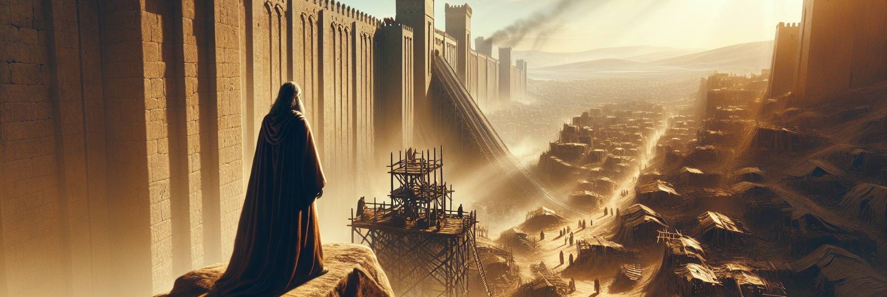 第十年の十月、エルサレムの城壁が軋む音は、もはや日常の一部になっていた。十八か月にも及ぶ包囲は、街を瓦礫と飢えの廃墟へと変えていった。空気は常に煙と塵埃で濁り、かつて賑わった路地からは、絶望の呻きだけが聞こえる。王ゼデキヤは、ダビデの宮殿の奥深くで、日に三度使者からの報告に耳を傾けていたが、その顔には最早、確かなる意志の影さえなかった。