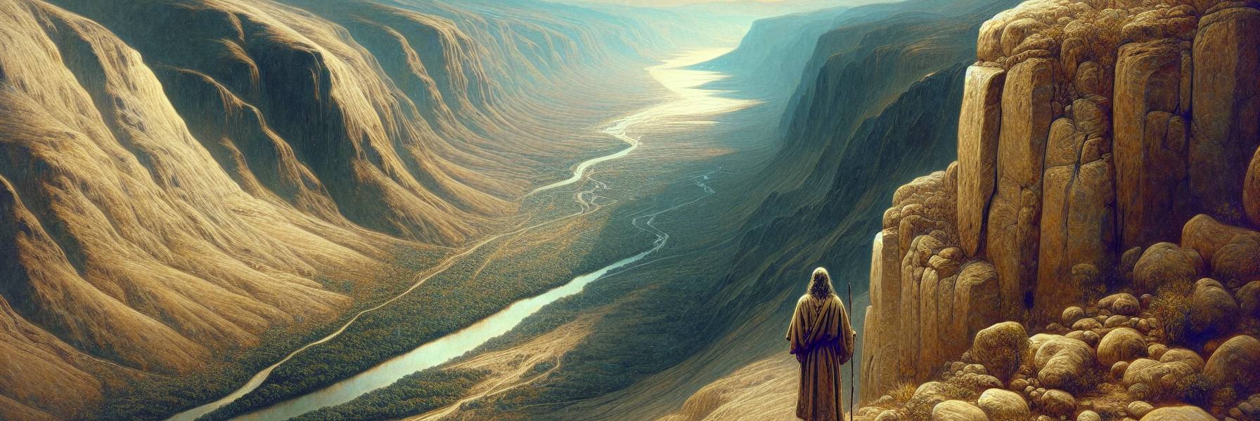 頂上に立つと、突如として視界が開けた。東から昇る朝日が、ヨルダン川の流域全体を黄金に染めていく。眼下には、広大な塩の平原、死海の青黒い輝きが横たわり、その向こうには、うっすらと霞むエリコの町の棕櫚の林が見える。北へと目を転じれば、ギルガルやベテルへと続く丘陵地帯が幾重にも連なり、遥か遠くには、エフライムとマナセの山地が青い影を落としていた。西には、地中海へと続く平野が広がっているのかもしれない。風が吹き抜け、彼の白髪を揺らした。ここが、約束の地か。