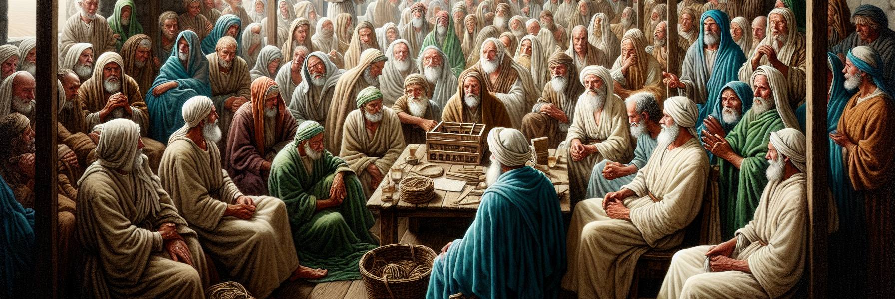 数日後、彼は思い切って、金細工師のアリストスの家を訪ねた。小さな中庭には、十人ほどの男女が集まっていた。ローマ風の髪を結った女性、額に汗の光る荷運び人、目に知性の光を宿す年老いた学者風の男。そこには、この街でよく見る社会的な境目が、どこかぼやけていた。パウロ本人はもういない。エペソへと去った後だ。代わりに、シラスという、落ち着いた物腰の男が、羊皮紙の巻物を前に座っていた。