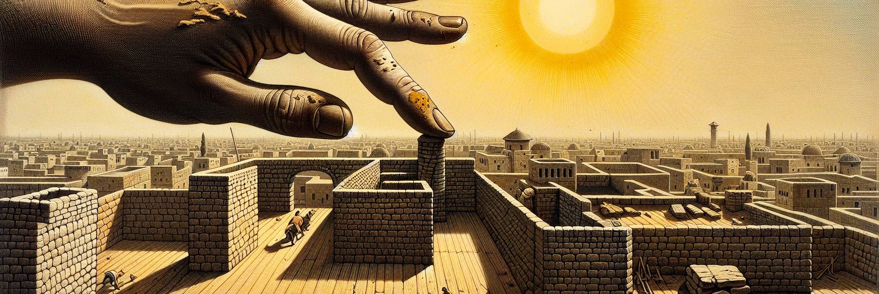 理由は尋ねられない。預言者に与えられたのは、理解ではなく従順だ。私はゆっくりと立ち上がり、作業場の隅で乾ききった粘土の板を探した。手のひらに収まる大きさだ。尖った石を見つけ、蹲り、その表面に向かって刻み始める。城壁の線。神殿の区画。町を貫く谷。私の知るエルサレムの細部が、無機質な粘土の上に蘇っていく。每一線が、胸を締め付ける。これはもう地図ではない。墓碑銘だ。