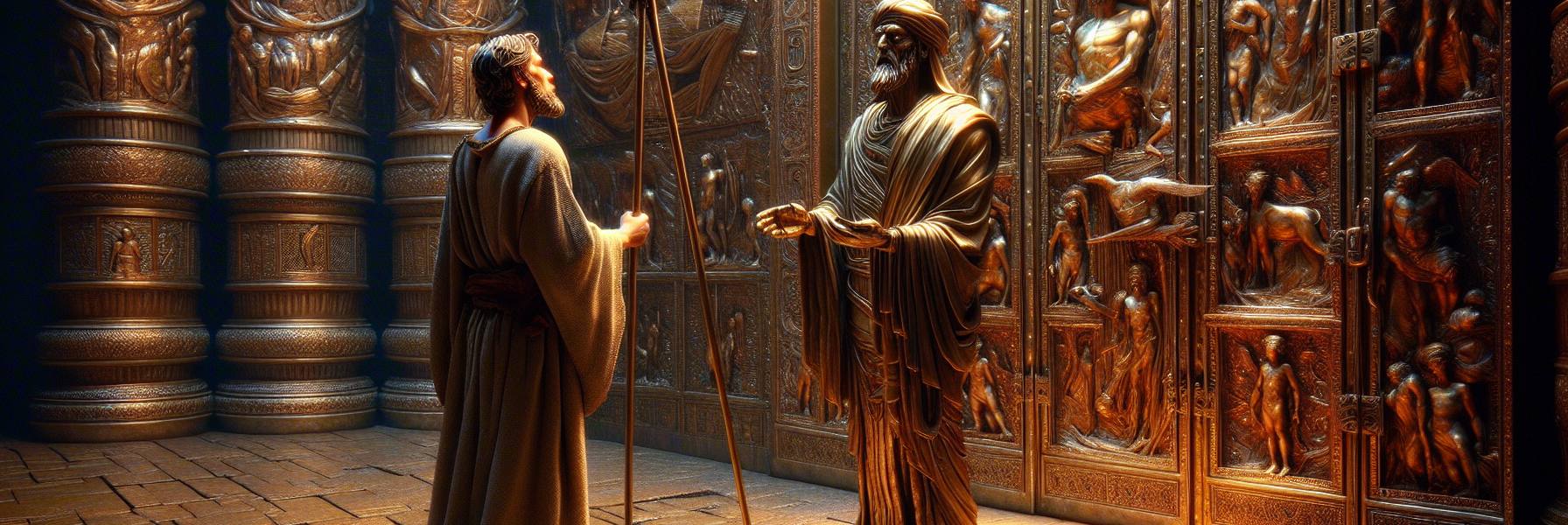彼らは私を神殿の東の門のところに立たせた。門は閉ざされ、重厚な木材と青銅の輝きが、午後の強い日差しを跳ね返していた。すると、その男の一人が、私の知っているはずのない小さな出入り口を開いた。唸るような音と共に、古い石が動き、仄暗い通路が現れた。