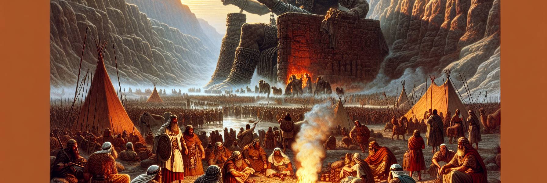 荒野の風は、乾いた土の匂いを運び、岩肌を撫でてゆく。遠くにヘルモン山の雪頂が鈍い光を湛え、一日の終わりを告げていた。私たちは、バシャンの平野に陣を敷いていた。目の前に広がるのは、王オグの領土──彼の寝台が鉄でできていた、と噂されるほどの巨人の国の残骸だ。