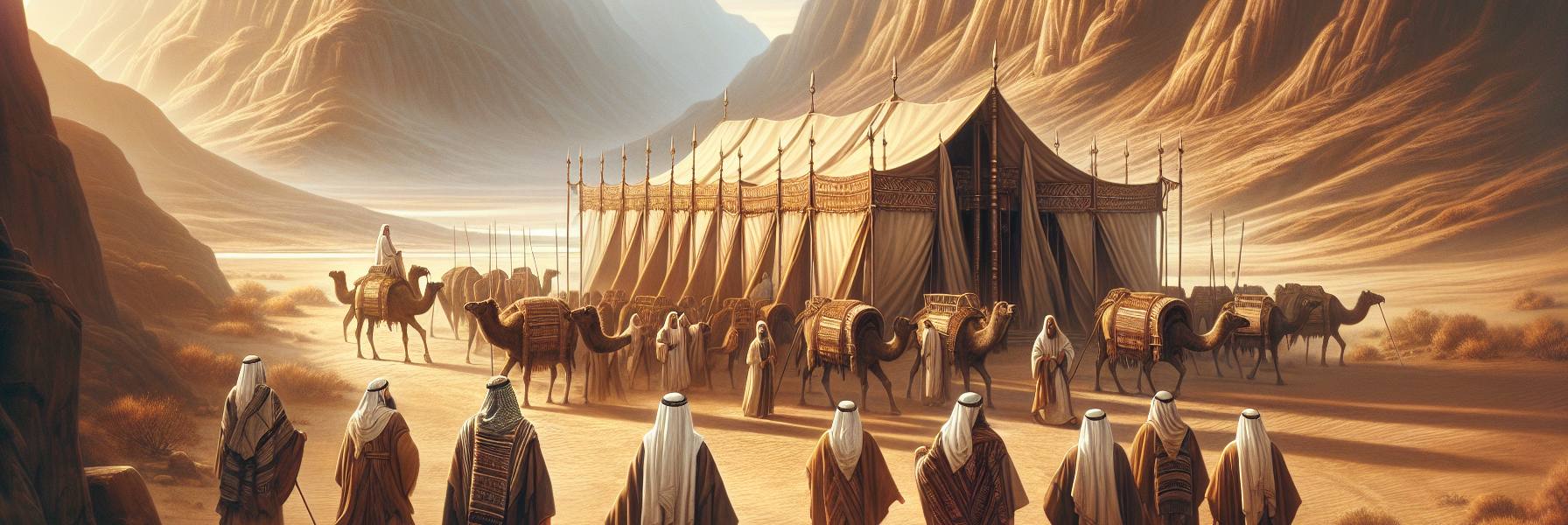 荒野の風は、冷たく乾いていたが、この日ばかりは、そこに一種の温もりが漂っているようだった。幕屋が完成してから七日目。亜麻の白い布とやぎの毛の覆いで形作られた聖なる空間は、既に神の栄光で満たされていたが、今、もう一つの奉献の時が訪れようとしていた。朝もやが砂岩の台地を覆う中、モーセは幕屋の入口の前に立ち、遠くから近づく人影の群れを見つめていた。彼らの肩には重そうな担ぎ棒がかかり、その先に揺れる供え物の器が朝日にきらめいた。