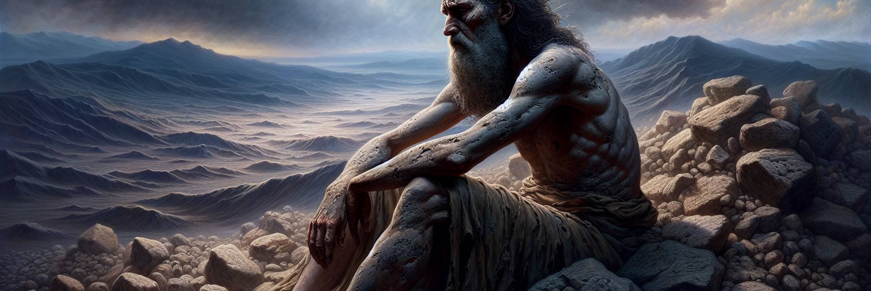 地は固く、ひび割れていた。長い苦しみの末に訪れた沈黙ほど重いものはない。ヨブは灰の上に座り、顔は地面に向けたままだった。皮膚は病に侵され、骨は痛みを覚え、それ以上に魂が乾ききっている。友たちの言葉は、もう風のように通り過ぎるだけだった。彼らが語る神は、あまりに整いすぎていて、まるで人間の理屈で組み立てられた精巧な偶像のようでならなかった。