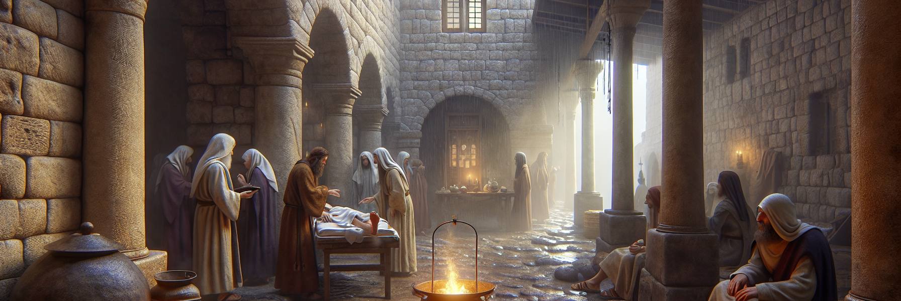 枕元のランプの灯りが、ゆらりと揺れた。オリーブ油のほのかな焦げた香りが、病室の重い空気に混じる。ダビデは毛布の下で、微かに震える指を動かしてみた。関節の痛みは、すでに日常となっていた。窓の外では、エルサレムの宵の気配が迫り、遠くで商人たちの声がかすかに聞こえる。もう、あの活気ある街のざわめきに加わることはないのか――そんな思いが、彼の胸を締め付けた。