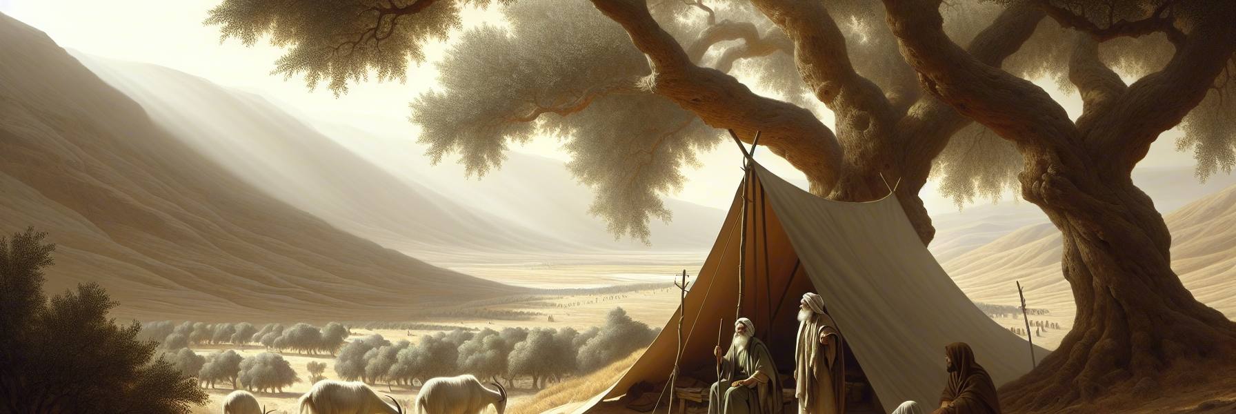 アブラムは天幕へと急いだ。サライが中で何かを縫っているところだった。「早く、良い粉を三セアほど取ってこねて、菓子を作ってくれ」彼の声は慌てていたが、目は輝いていた。サライは何も尋ねず、静かにうなずいた。彼は続けて子飼いの牛のところへ走り、柔らかい良い子牛を選び、若者に急いで調理するよう命じた。そして凝乳と牛乳、そして出来上がった子牛の肉を整え、彼らの前に並べた。彼自身、木の下の彼らの傍らに立っていた。