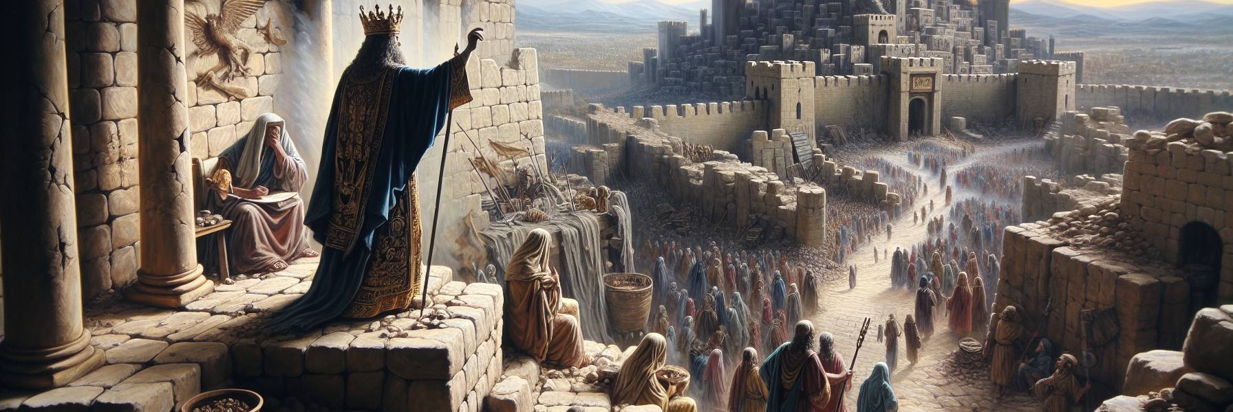 壁はもう長いこと続いていた。二年目か、三年目か。時間の感覚は、腹を空かせた者には意味をなさない。エルサレムの城壁の上から見下ろすと、バビロニアの陣営の炊事の煙が、夕暮れの空にまっすぐに立ち上っていた。我々にはもう煙など立てる糧もなかった。家々の梁は剥き出しになり、通りには父が子を、子が父を食べたという噂が、囁きのように蔓延っていた。ゼデキヤ王は、まだ宮殿の奥深くで、何かしらの神託を待ち続けているのだろうか。彼がエレミヤの言葉を聞き入れなかったあの日から、すべては決まっていたように思えた。