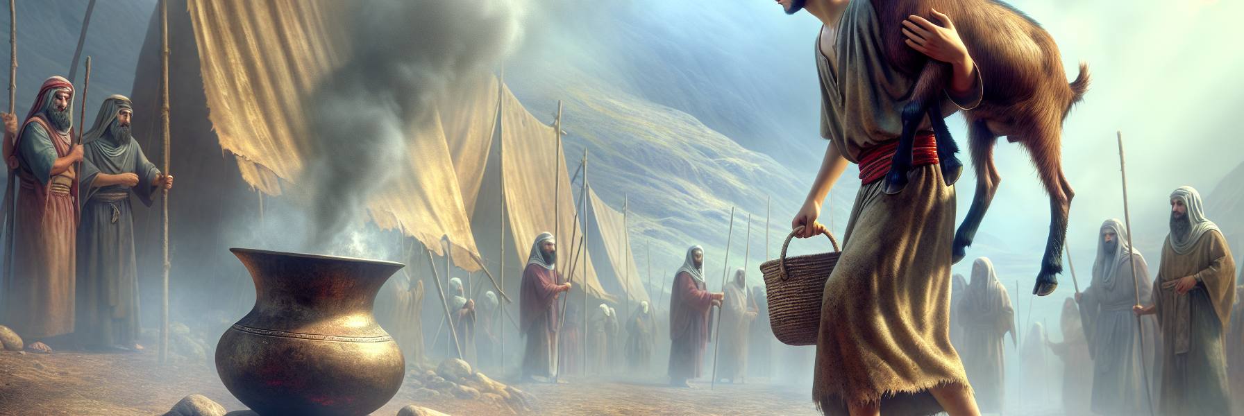 祭りの前日、アヒムは羊の首に柔らかな麻紐をかけ、幕屋へと向かう道を歩き始めた。砂利の道が次第に多くの足跡で踏み固められ、やがて遠くに亜麻布の天幕の頂上が見えてくる。人々のざわめき、土器の音、子どもたちの甲高い声が混ざり合っていた。彼は羊を連れているため、自然と道の端を歩いた。羊は時折、足を止めて道端の矮せい柳の若葉を食べようとした。