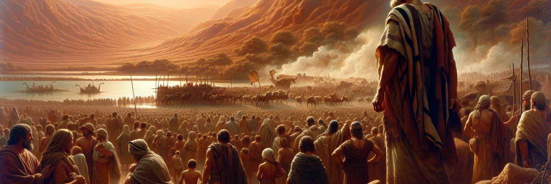 夕陽が傾き、平原に長い影を落とし始めた。ヨシュアは、再び西を眺めた。やがて彼らが足を踏み入れるその地は、乳と蜜の流れる場所であると共に、信仰が試される炉でもあるのだ。彼は、この若者たちが、形あるものに心を奪われることなく、あの「声」を聞き分ける民であり続けられるように、と静かに祈った。そして、その祈りは、数千年の時を超え、今日を生きる我々の胸の中にも、微かに、しかし確かに響き続けているのである。