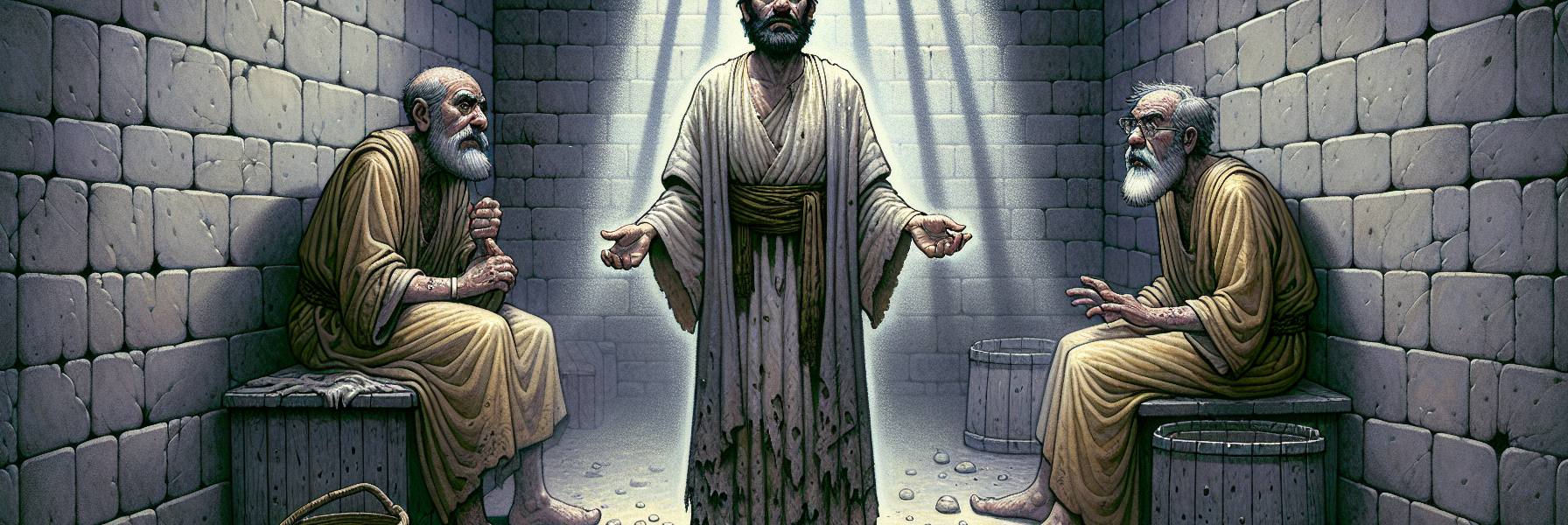 ある朝、牢屋の扉が軋み、いつもより大きな物音がした。護衛兵に挟まれて二人の男が入って来る。その服装からして、明らかに普通の囚人ではなかった。一人は細身で神経質そうな目をしており、もう一人はがっしりとした体格で、しかし肩の力が抜けきっている。彼らはヨセフと同じ区画に置かれた。