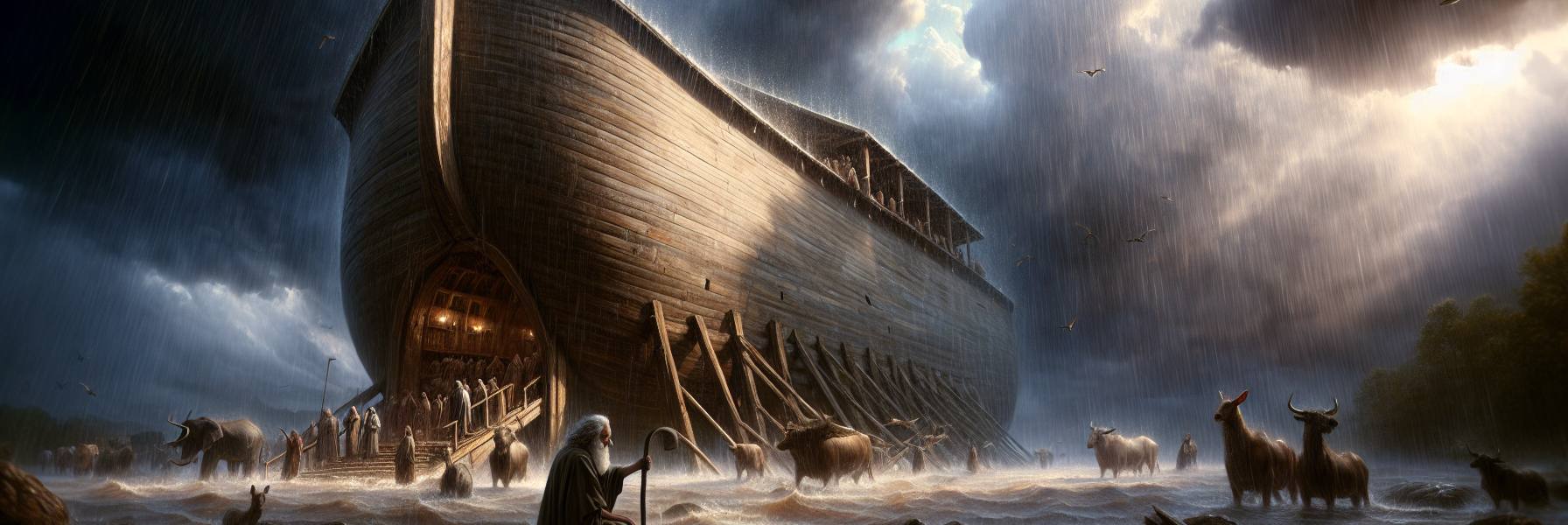 その時、神がノアに告げられた。「箱舟から出なさい。あなたも、あなたの妻も、あなたの息子たちも、息子たちの妻たちも。すべてあなたと共にいる生き物、肉なるもの、鳥も家畜も地を這うものも、みな連れ出しなさい。それらが地に群がり、地にふえ、地に増えるように。」
