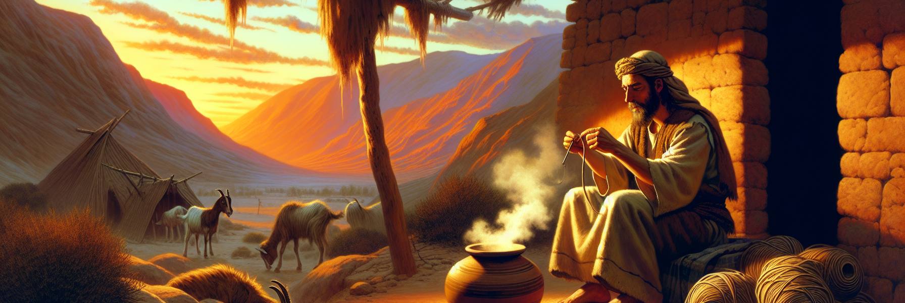 夕暮れが、葦で編んだ天幕の影を長く砂の上に引き伸ばしていた。一日の熱気が引き、代わりに砂漠特有のひんやりとした空気が忍び寄る時刻である。長老のエリアブは、入口の革の敷物に腰を下ろし、遠くに連なる紫がかった山脈をぼんやりと眺めていた。彼の背後では、家族が夕餉の支度をする気だるい物音が聞こえる。丁度その時、二人の男が、沈みゆく太陽を背に、真っ直ぐに彼の天幕へと歩み寄ってくるのが見えた。一人は顔をこわばらせ、もう一人は必死に何かを訴えるように手を振っている。エリアブは微かにため息をついた。争いの匂いがした。