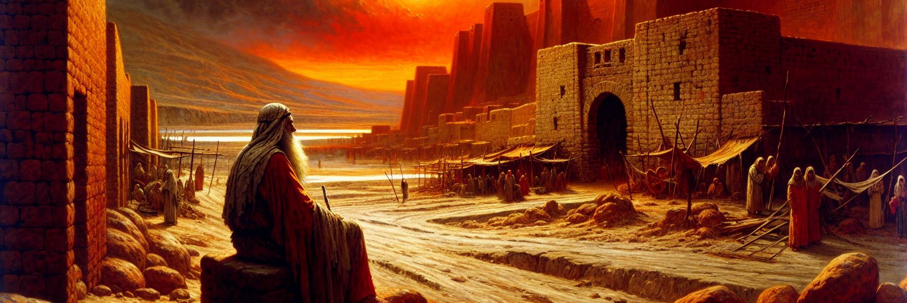夕暮れがソドムの町を包み始める頃、ロトはいつものように城門の傍らの石段に腰を下ろしていた。西の空に沈みゆく太陽は、砂埃に覆われた家々の壁を鈍い赤に染め、長く歪んだ影を路上に引き延ばしていた。町からは喧騒が聞こえる―笑い声、怒鳴り声、陶器の割れる音、どこか遠くで続く、調子はずれの笛の音。彼はそっと息をついた。この町に腰を落ち着けてから、どれほどの年月が経っただろう。初めは緑豊かなヨルダンの低地全体を見渡せる高台に天幕を張っていたが、次第に町の便利さに引かれ、いつの間にかこの城門の内側に家を構えるまでになっていた。
