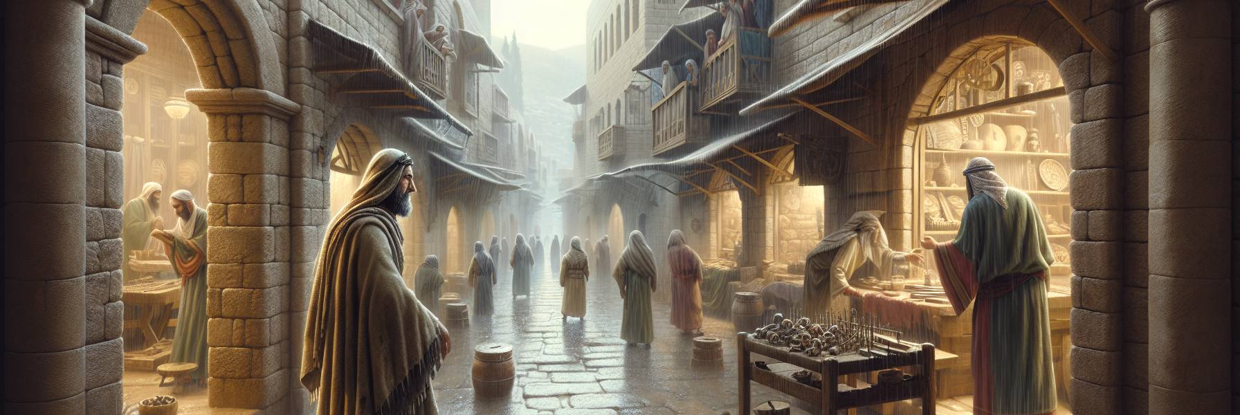 エルサレムの路地は、夕暮れの煙と共に暮れていく一日のざわめきを包み込んでいた。アヒカムは工房の戸を半ば開け、外の空気を深く吸い込んだ。羊の脂と松やに、遠くから運ばれてくる供物の香りの混ざった、都特有の匂いだ。彼の指先には、まだ杉材を削った後の微かなざらつきが残っている。
