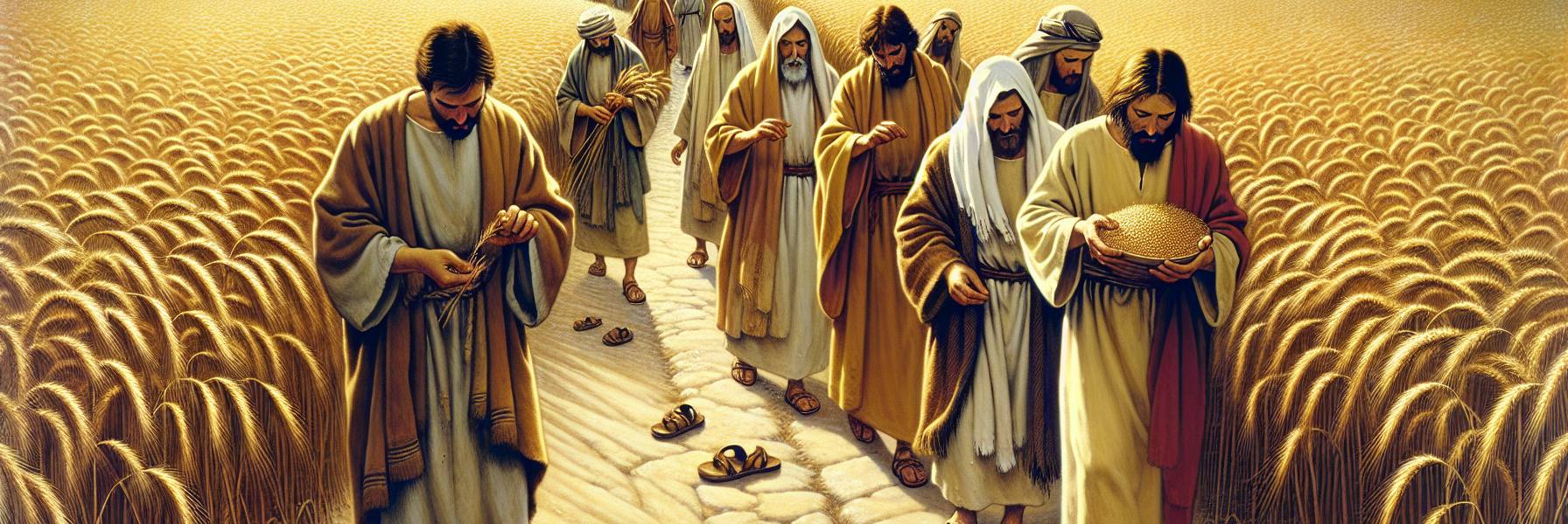 その日は安息日であった。ガリラヤの丘を抜ける小道は、普段よりも静かで、足元の土の感触さえもが、何かを慎んでいるように思えた。風が通ると、道端に広がる麦畑がざわめき、黄金の穂がこすれ合うかすかな音だけが、午後の空気を切っていた。一行は黙々と歩いていた。空腹は、もうしばらく我慢できるような、できないような、あの微妙な頃合いだった。ペトロがふと、無造作に麦の穂を一枝、手折った。もみ殻を掌ですり、軽く吹いてから口に入れる。ほかの弟子たちも、それに倣った。何ということもない光景だった。旅路ではよくあることだ。