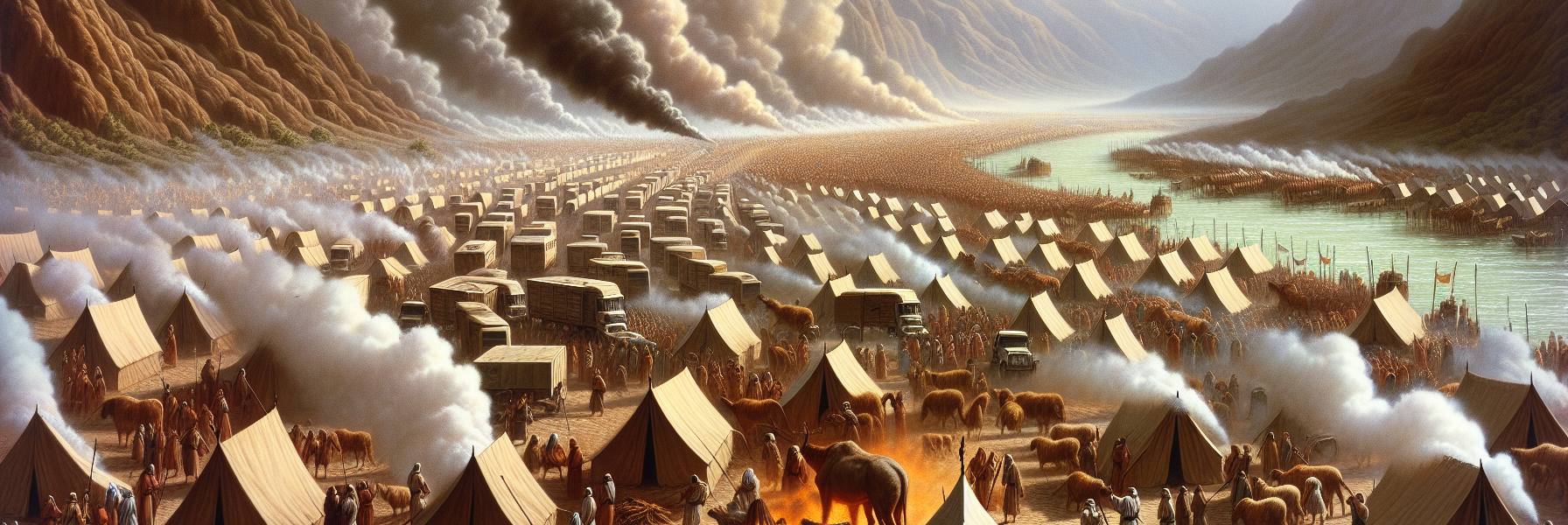夜明け前の闇が、ヨルダン川の流域をまだ深く覆っていた。冷たい砂の上に腰を下ろし、ヨシュアは目を閉じた。耳には、遠くで響く水流の音と、幾千とも知れぬ民の寝息が混ざり合って届く。彼らの不安は、匂いのように空中に漂っていた。乳と蜜の流れる地――約束の地は、この川の向こう側にある。しかし今は増水期である。雪解けの水がヘルモン山から流れ下り、ヨルダンは本来の穏やかな流れを失い、荒れ狂う獣のように岸を削っていた。